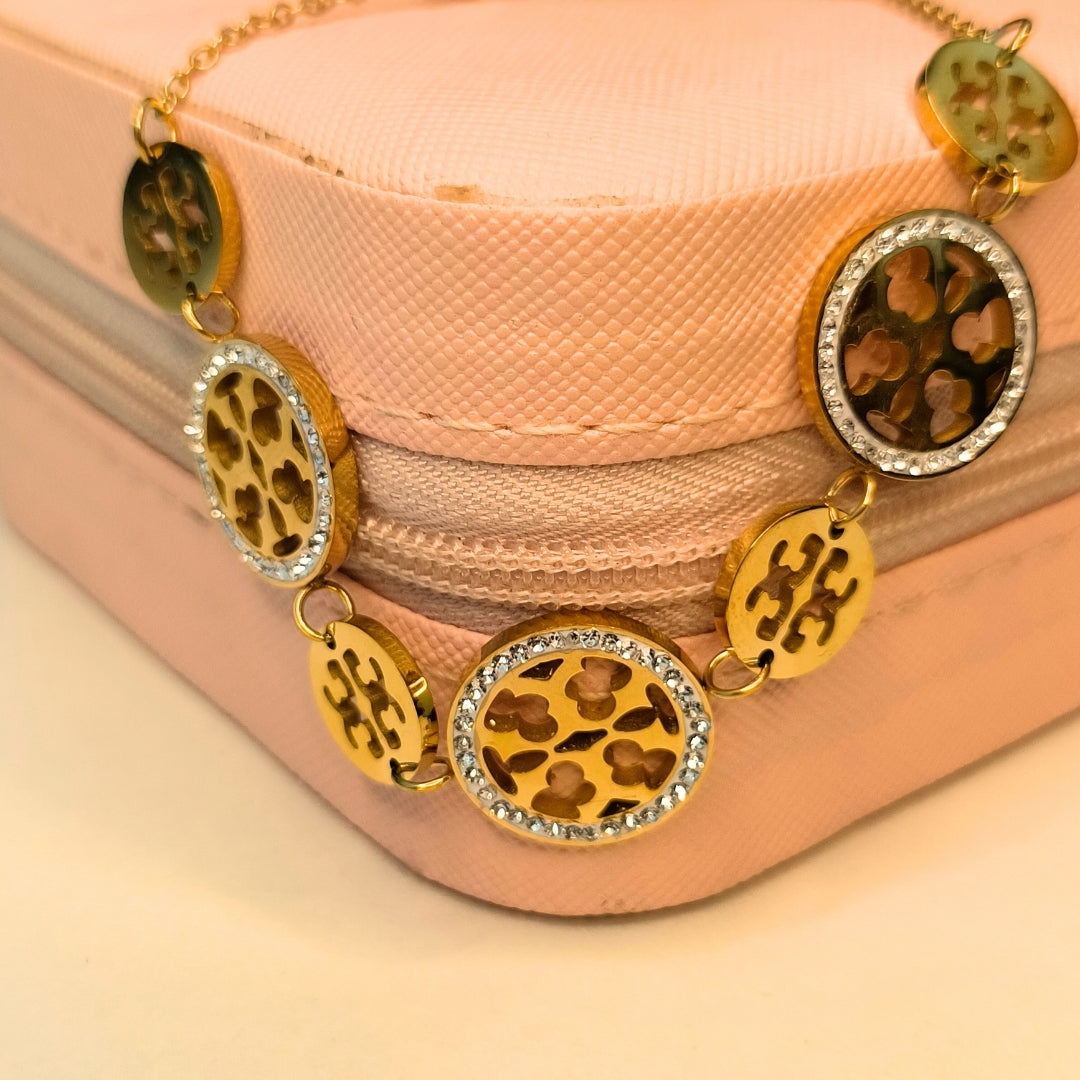 Elevate your elegance with the Pyari Jewellery Gold Plated Circle Charm Bracelet — a stunning blend of luxury and modern artistry. Featuring glossy gold circles and crystal-studded highlights, this bracelet embodies grace and versatility. Perfect for casual wear or special events, it enhances feminine charm with timeless sophistication.