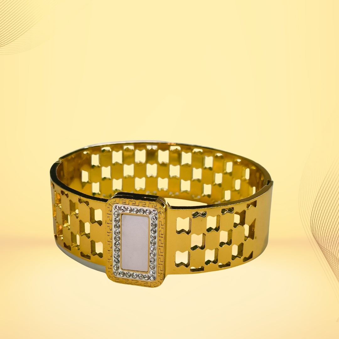 Elevate your style with the Pyari Jewellery Premium Gold-Finish Rectangle Dial Bracelet. Featuring a chic rectangular dial-inspired design framed with sparkling crystals, this luxurious-looking bangle adds modern elegance to any outfit. Lightweight, skin-friendly, and affordable, it’s perfect for daily wear or special occasions.